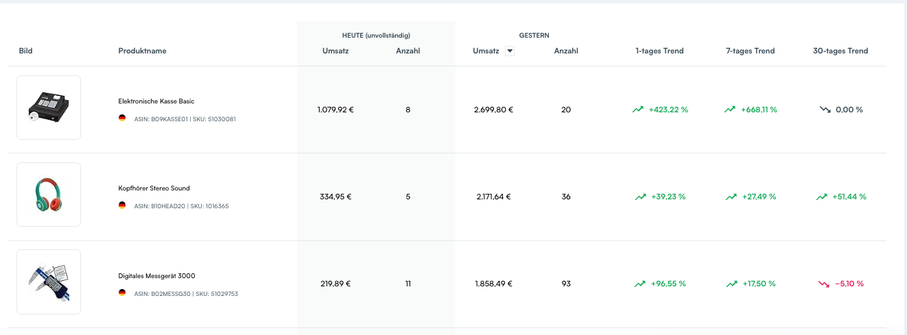 Top/flop lists: Keep an eye on your bestsellers and optimize underperforming products.